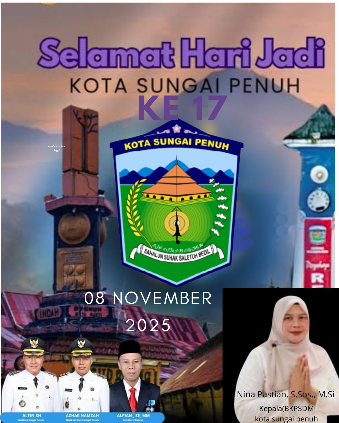 Sungai Penuh – Dalam momentum peringatan Hari Ulang Tahun (HUT) ke-17 Kota Sungai Penuh, Kepala Badan Kepegawaian dan Pengembangan Sumber Daya Manusia (BKPSDM) Kota Sungai Penuh, Nina Pastian, S.Sos., M.Si, menyampaikan ucapan selamat serta doa terbaik untuk kemajuan Kota Sungai Penuh.