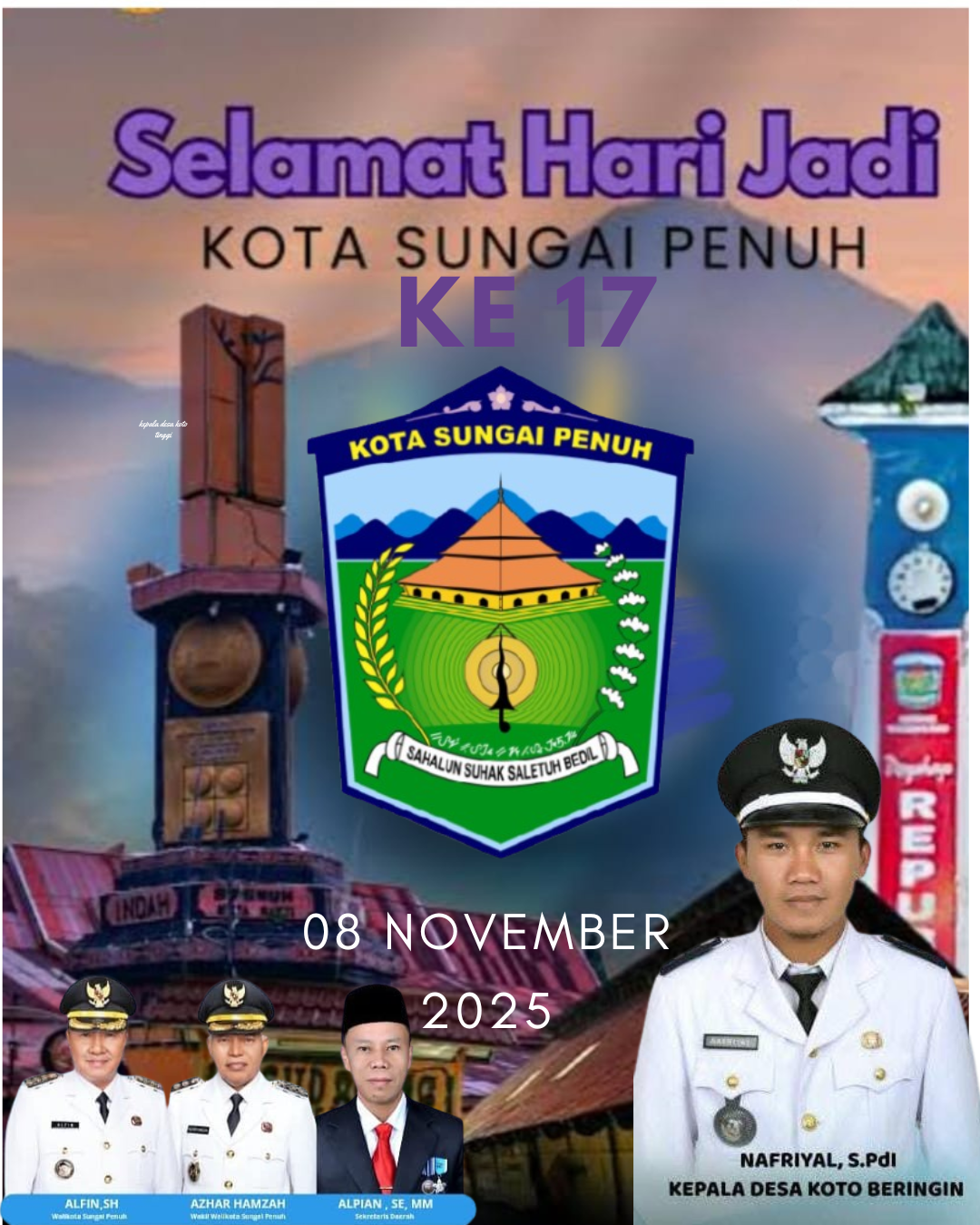 Sungai Penuh, 8 November 2025 – Dalam rangka memperingati Hari Jadi ke-17 Kota Sungai Penuh, Kepala Desa Koto Beringin, Nafriyal, S.Pd.I, menyampaikan ucapan selamat dan apresiasi kepada seluruh masyarakat Kota Sungai Penuh atas semangat kebersamaan dan kemajuan yang telah diraih selama 17 tahun perjalanan kota ini.