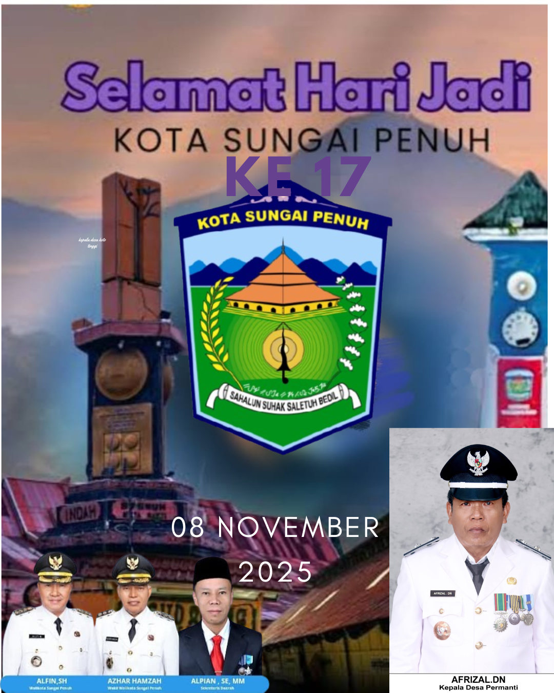 Atas nama Pemerintah Desa Permanti, saya mengucapkan selamat Hari Jadi ke-17 Kota Sungai Penuh. Semoga semangat kebersamaan terus memotivasi kita semua untuk mewujudkan Kota Sungai Penuh Juara,” ujar Afrizal D.N.